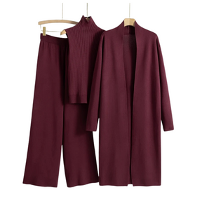 O Conjunto Maristela tem sofisticação e aconchego em um look só. Composto por três peças – calça larga, blusa canelada sem mangas e um maxi cardigan leve – ele é a definição de elegância casual. Ideal para quem ama se vestir bem sem abrir a mão do conforto. Use com tênis, botas e saltos para um visual moderno e versátil, perfeito para todos os benefícios.
