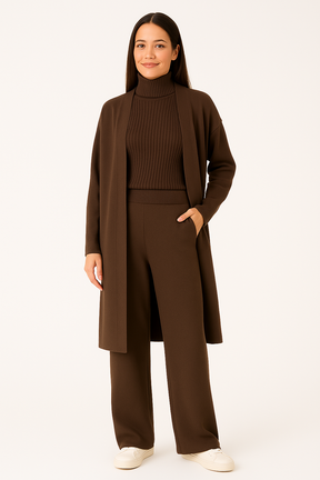 Detalhe: Calça reta com elástico na cintura, Blusa canelada sem mangas e gola alta, Cardigã longo e fluido, sem abotoamento