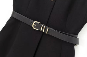 Detalhe: Botões frontais, cinto com fivela dourada, corte reto com leve abertura frontal na barra