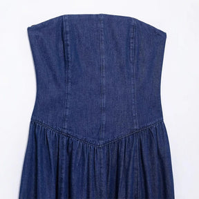 Detalhe: Modelagem tomara-que-caia, busto estruturado, saia fluida com pregas leves